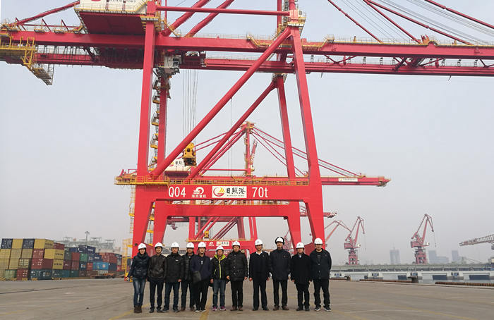 次日,在日照港客戶的大力支持下,考察團隨同我司工作人員前往日照港,參觀考察了我司為其定制生產(chǎn)的大型岸橋、場橋、糧食碼頭門座起重機等設(shè)備,使考察團對設(shè)備的現(xiàn)場使用情況有了更進一步了解。