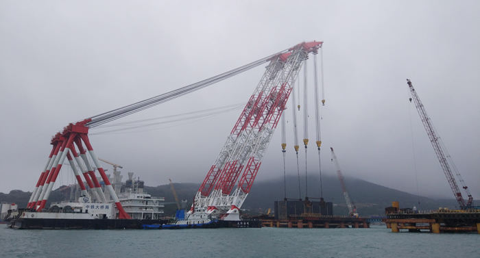 為該項目的主承建方——中鐵大橋局量身打造的3600噸浮式起重機,由青島海西重機自主研發(fā)、設計、制造、安裝和調(diào)試,采用變幅式雙臂架結(jié)構(gòu),其起重重量為3600噸,最高起升高度110米,不僅減小了橋梁吊裝吊具結(jié)構(gòu),而且提高了橋梁吊裝的有效高度,極大地滿足了橋梁吊裝施工的要求,經(jīng)受住了現(xiàn)場惡劣海況的考驗,成為大橋建設“左膀右臂”,被用戶親切地稱為“海上建橋神器”。