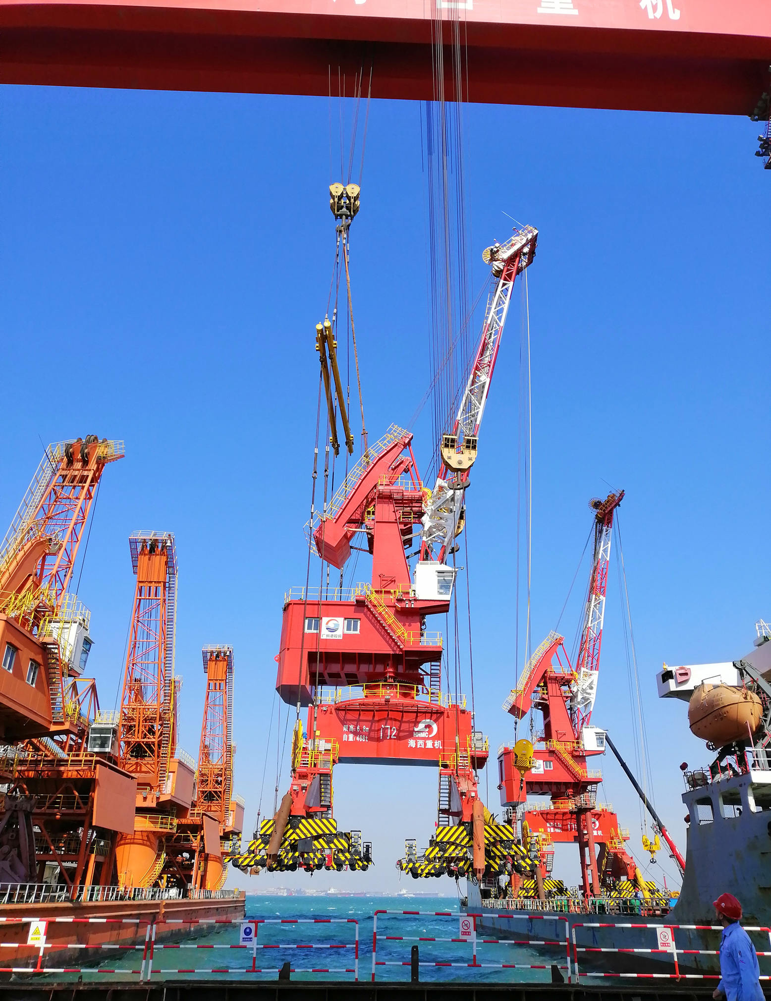 因初次起吊整機(jī)上船,船面空間緊湊,在場(chǎng)所有的工作人員都屏住了呼吸,時(shí)刻觀察著,現(xiàn)場(chǎng)除了龍門(mén)吊運(yùn)轉(zhuǎn)的轟鳴聲,就只剩下海浪拍打碼頭的聲音在耳邊回響。“耶!落位成功!”——靜靜地關(guān)注著這一過(guò)程的我們?cè)诼湮怀晒Φ哪且凰查g,心底無(wú)比的振奮,澎湃的心潮久久不息。自14日下午18點(diǎn)開(kāi)始吊裝前詳細(xì)的聯(lián)合檢查,確認(rèn)無(wú)誤后,20點(diǎn)正式起吊,22點(diǎn)落位完成,23點(diǎn)順利摘鉤,經(jīng)過(guò)近5個(gè)小時(shí)的忙碌作戰(zhàn),整機(jī)吊裝工作一氣呵成,效率之高著實(shí)令人驚嘆。