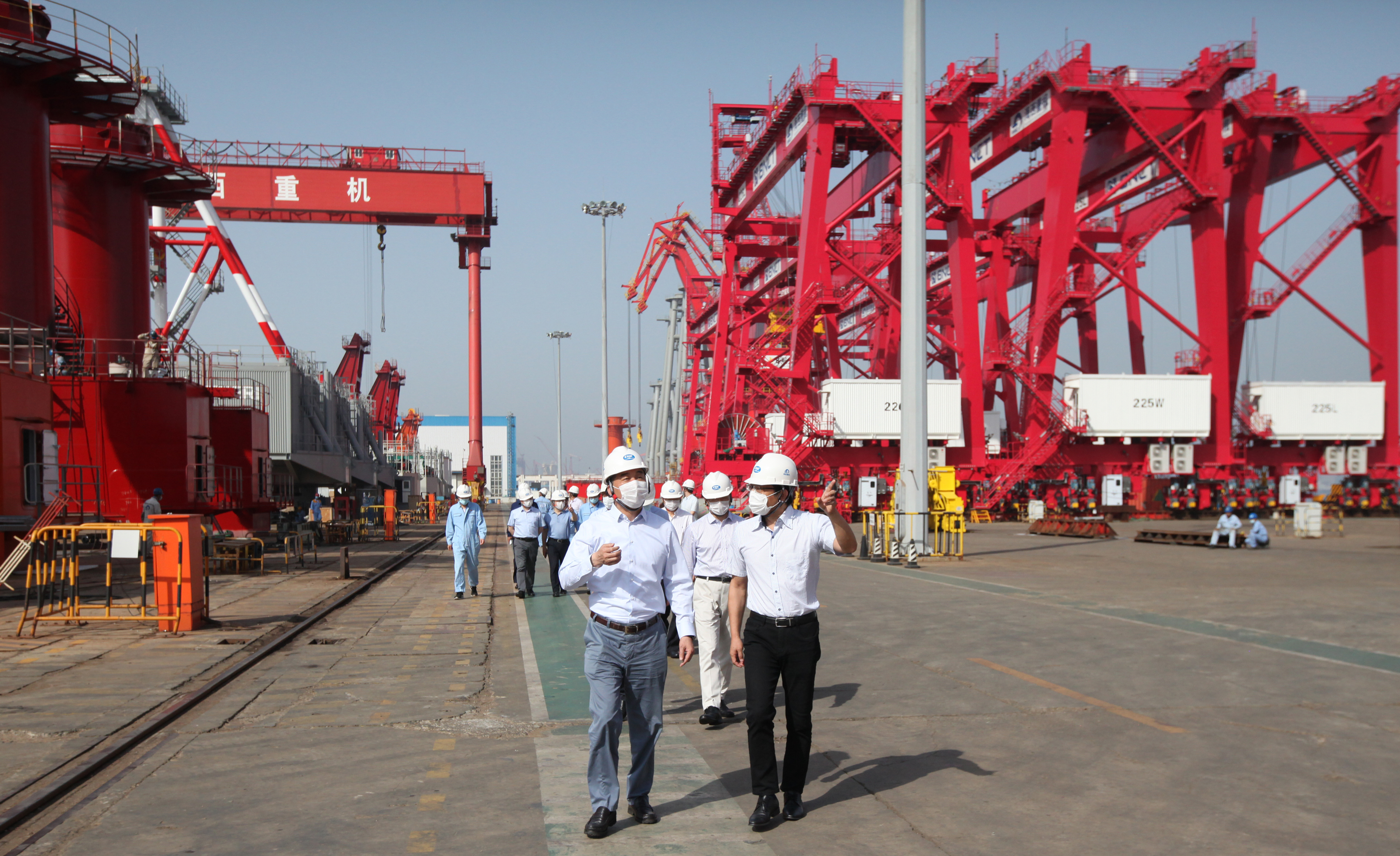孫偉一行參觀了海西重機(jī)生產(chǎn)現(xiàn)場(chǎng)和發(fā)運(yùn)碼頭,仔細(xì)聽取了馬聚勇對(duì)武漢船機(jī)和海西重機(jī)發(fā)展歷程、主營(yíng)業(yè)務(wù)、戰(zhàn)略定位以及生產(chǎn)經(jīng)營(yíng)形勢(shì)等方面的介紹。馬聚勇重點(diǎn)介紹了武漢船機(jī)海西重機(jī)在港機(jī)市場(chǎng)、自動(dòng)化碼頭以及海工平臺(tái)等方面的發(fā)展情況,以及疫情防控期間生產(chǎn)經(jīng)營(yíng)上取得的不俗的成績(jī)。