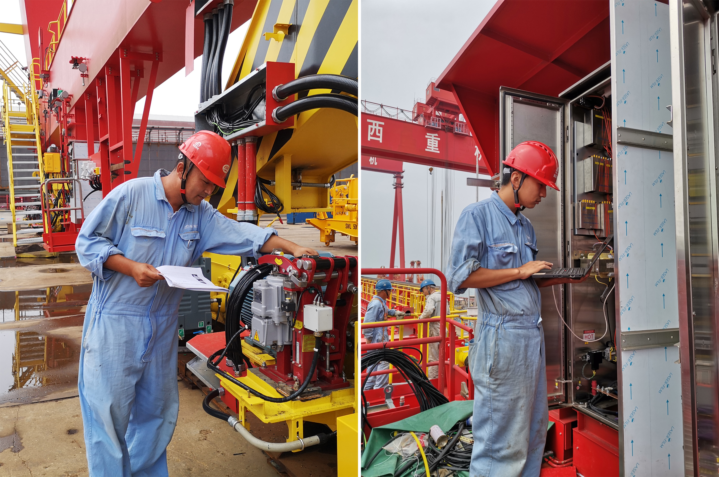 為了保障日照港集裝箱自動(dòng)化堆場(一期)作業(yè)100萬標(biāo)箱儀式重大活動(dòng)的順利召開,海西重機(jī)接到用戶10臺(tái)自動(dòng)化軌道吊徽標(biāo)涂改需求后,項(xiàng)目管理部便及時(shí)安排涂裝部組織人員及準(zhǔn)備設(shè)備設(shè)施,涂裝部不等不靠,組織施工人員連夜趕往日照港現(xiàn)場,現(xiàn)場負(fù)責(zé)人李春鵬帶領(lǐng)施工人員,克服工期緊、任務(wù)重、施工難度大的困難,積極發(fā)揮主觀能動(dòng)性,攻堅(jiān)克難,在確保安全、質(zhì)量前提下,連續(xù)3晚工作到后半夜,如期完成設(shè)備徽標(biāo)涂改全部工作,保障儀式順利召開。