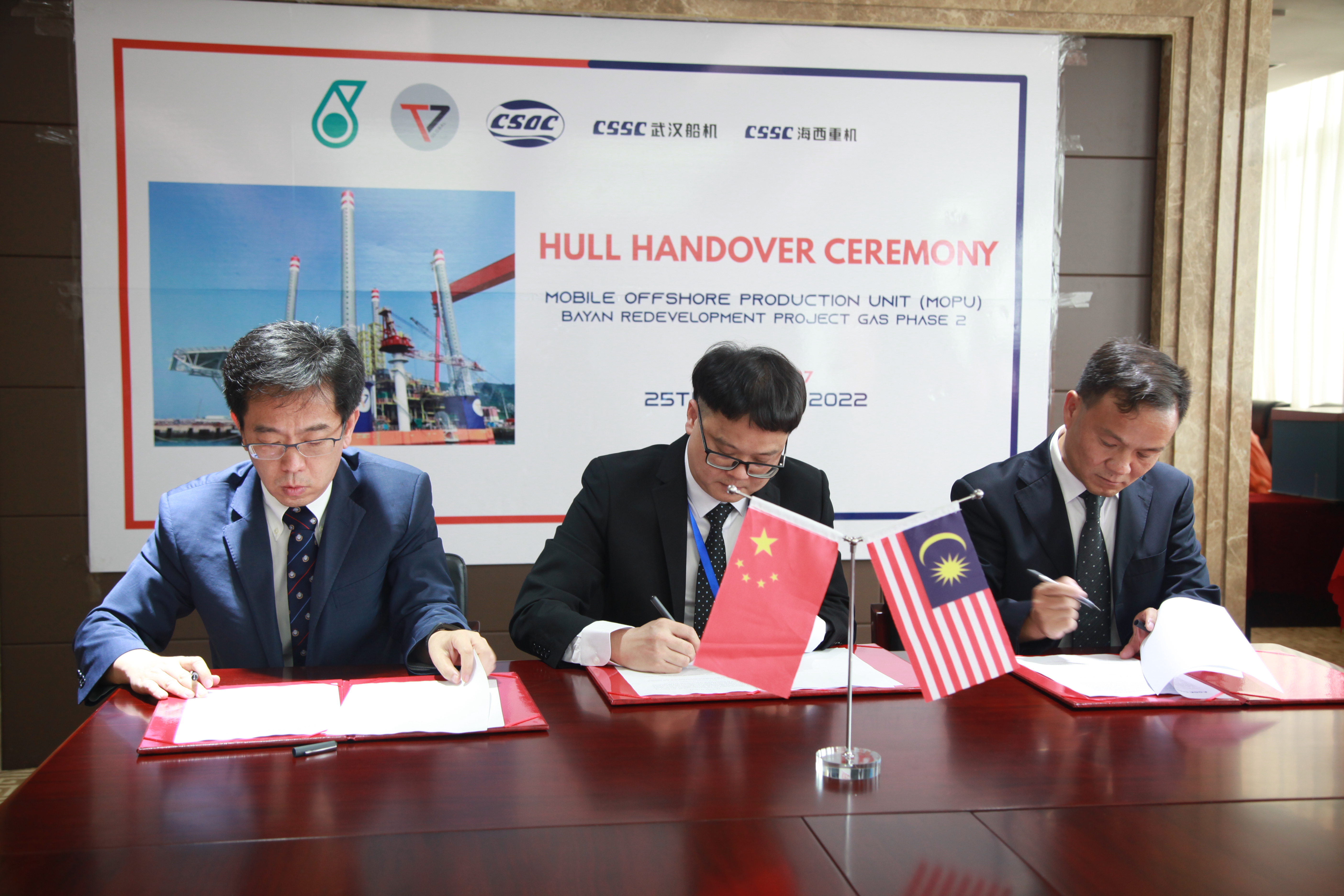 8月25日下午,由武漢船用機械有限責任公司總包,青島海西重機有限責任公司建造的馬來西亞可移動自升式生產(chǎn)(天然氣)平臺(簡稱MOPU)在中國船舶旗下武漢船機海西重機公司順利舉行交付簽約儀式,船東Tanjung Offshore、中國船貿(mào)和ABS船級社共同出席。