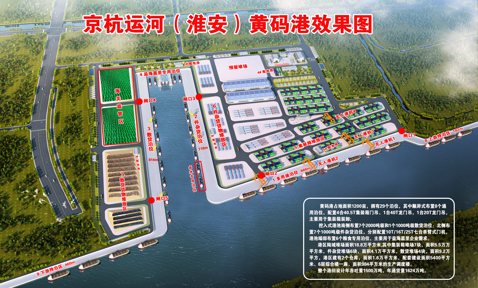 據(jù)了解,黃碼港位于京杭大運河和淮河入海水道交匯處,處于京杭運河蘇北段的中心,是通江達海、貫通南北的重要樞紐,是名副其實的“水上立交”。黃碼作業(yè)區(qū)項目規(guī)劃有29個千噸級裝卸泊位,可實現(xiàn)吞吐能力1650萬噸,是京杭運河沿線單體投資最大、泊位最多的港口,建成后將成為京杭運河主航道沿線重要的現(xiàn)代化內(nèi)河港口。