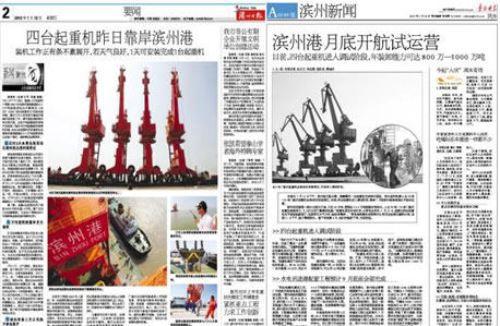 我公司為濱州港務(wù)有限責(zé)任公司承制的4臺MQ2533門座起重機(jī)于2012年7月10日運(yùn)抵濱州港碼頭后,引起了當(dāng)?shù)卣鐦O大關(guān)注。濱州市委書記、濱州市長辦公室、濱州市委組織部、濱州市海事局、濱州市公安局、以及各縣區(qū)級領(lǐng)導(dǎo),先后到碼頭進(jìn)行參觀指導(dǎo),濱州日報、魯北晚報更是多次到碼頭進(jìn)行采訪報道。