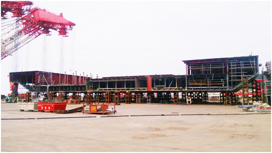 90米平臺船頭船尾的順利貫通是整船建造過程中的一個(gè)重要節(jié)點(diǎn),標(biāo)志著整船工作重心從結(jié)構(gòu)件分段制作順利過渡到船臺整體搭載,為該平臺如期順利下水奠定了基礎(chǔ)。