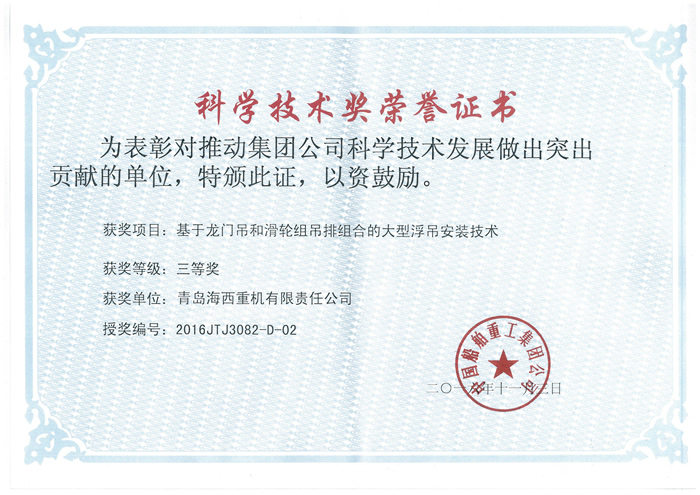 近日,集團(tuán)公司再傳喜訊,海西重機(jī)《基于龍門吊和滑輪組吊排組合的大型浮吊安裝技術(shù)》榮獲中國(guó)船舶重工集團(tuán)公司2016年度科學(xué)技術(shù)三等獎(jiǎng),科技研發(fā)再下一城,創(chuàng)新成果錦上添花。