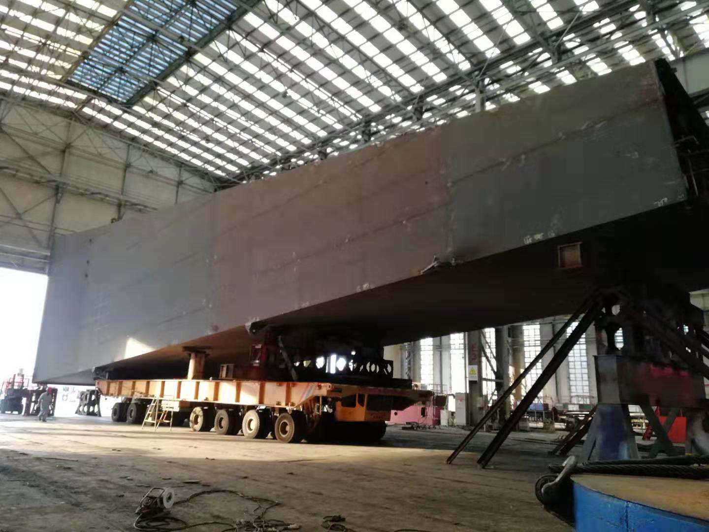 轉運伊始,在公司多部門的大力配合下,集思廣益,充分論證傾斜和加固轉運方案的可行性和可靠性,排除風險點,確保轉運工作萬無一失。8月19日開始做準備工作,積極制作各類工裝夾具,分步抬升、反復測量、多次修改,經過鋼構部三天兩夜的奮戰(zhàn),8月23日下午終于完成了全部轉運準備工作,開始轉運。18點整,剛腿分段最高點順利通過車間大門,距極限門高僅差不到20cm,19:30剛腿分段整體完全通過車間大門,平穩(wěn)轉運出車間。